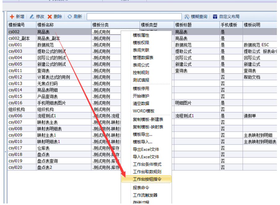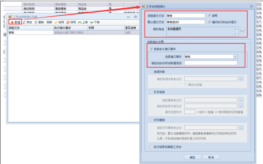 点击【新增】,建立一个工作台按钮指令,【按钮显示文字】指工作台按钮上显示的文字;【默认提示文字】值完成后提示的文字内容;【循环执行时合并提示】只提示一次下方选择;【授权角色】选择能使用按钮的角色;【报表命令接口事件】,接口事件为刚才建立的报表命令【审核】