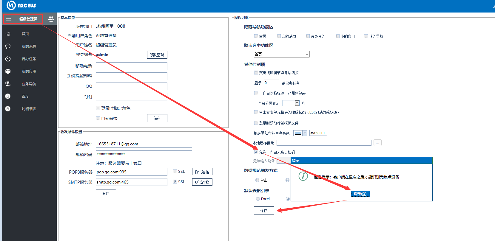 登录客户端,勾选【允许工作台无焦点扫码】,会跳出提示需要重启客户端,点击【确认】,再点击【保存】