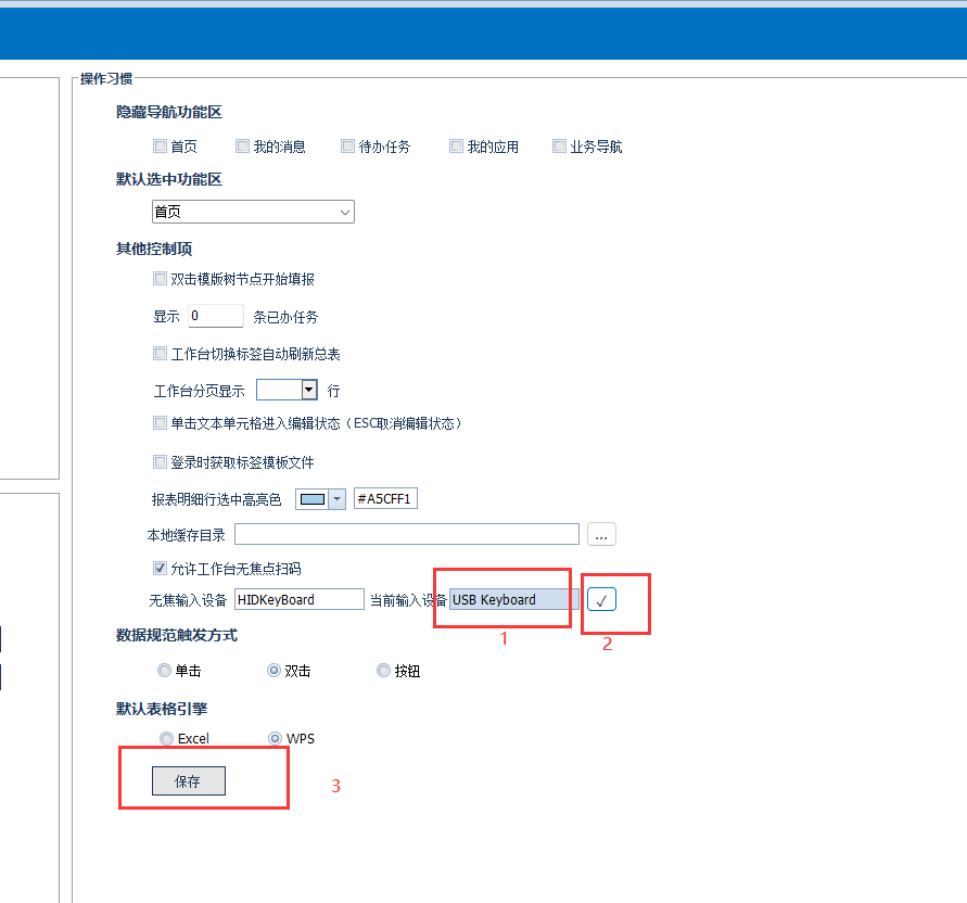 登录进去之后,插入扫码枪,随机扫一个码,1处会出现扫码枪sghe(此处应该是HIDKeyBoard,因为现在正在使用鼠标,所以是USB keyBoard),点击勾号,再点击保存,就可以使用了。