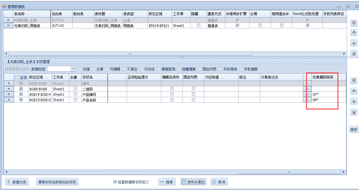 注意:如果明细和主表都设置有无焦捕获,那么输入焦点放在哪个里面就从哪个表里开始进行识别,另外有些PDA因为机制不同,有些扫码会识别填入当前停留的未设置无焦捕获规则的字段内