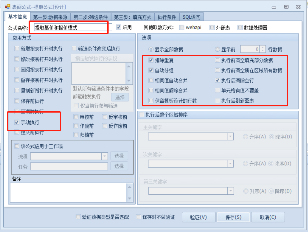 【公式名称】记录公式的名字,【应用方式】选择公式执行的时机,【选项】中勾选排除重读、自动分组、执行后清空空行