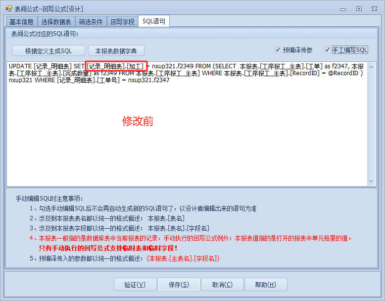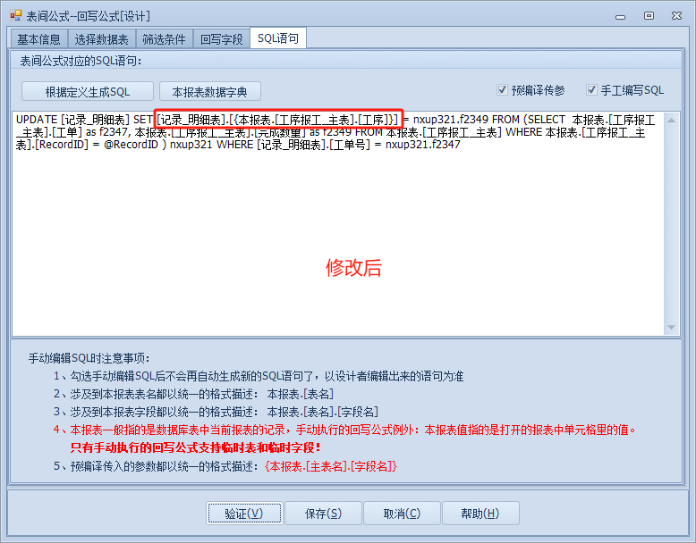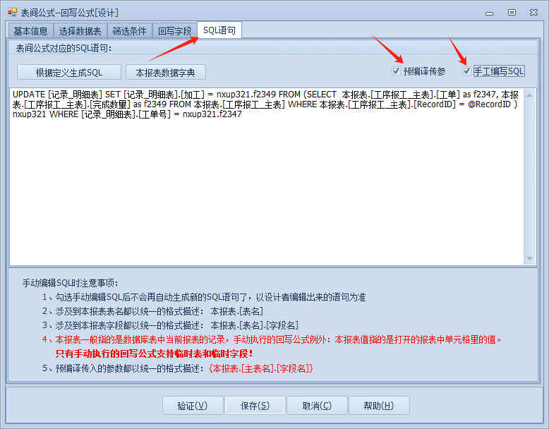 这是我们需要将定量改为变量,打开回写公式点击到sql语句,勾选预编译与手工编写。