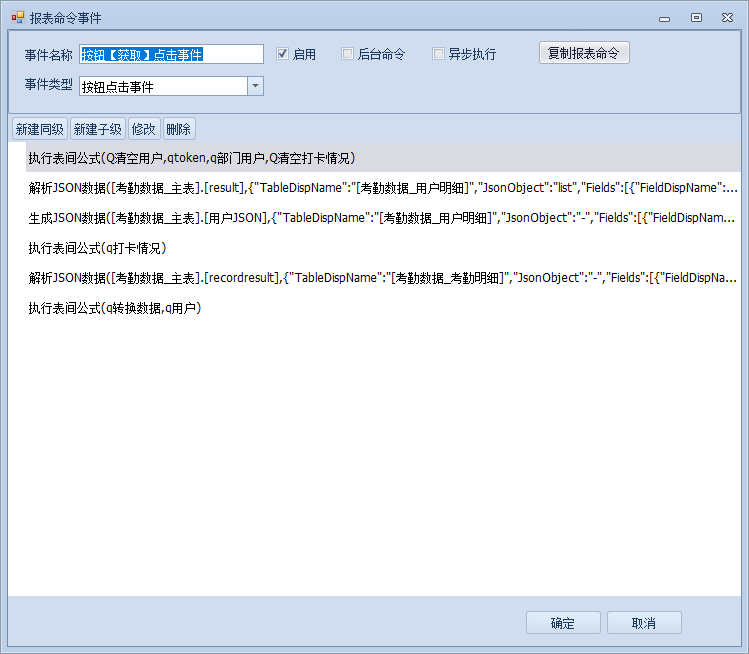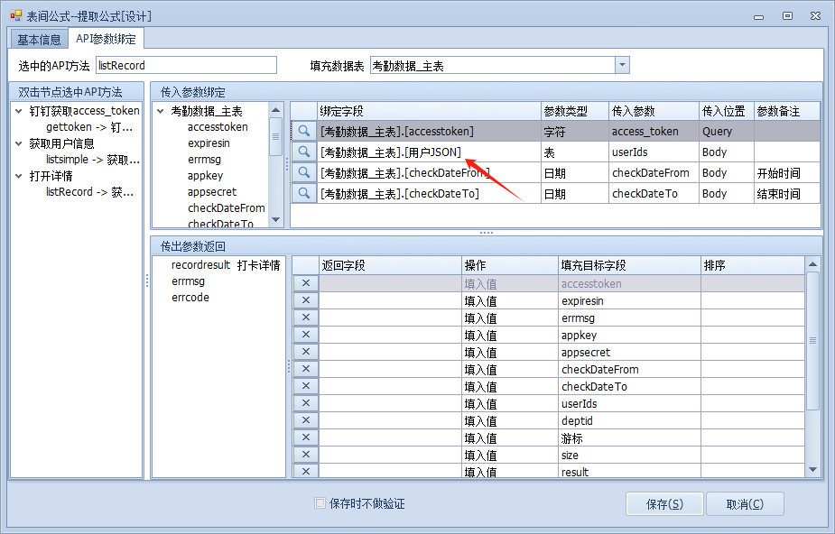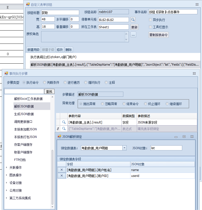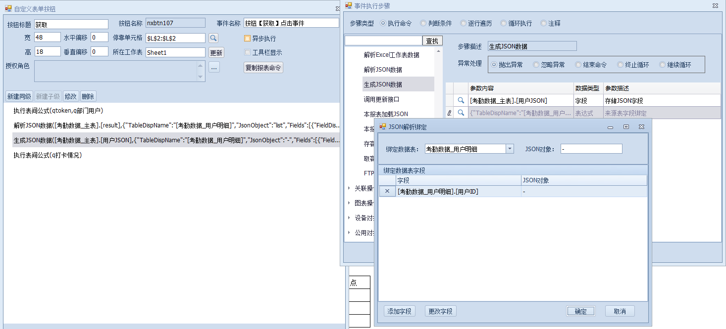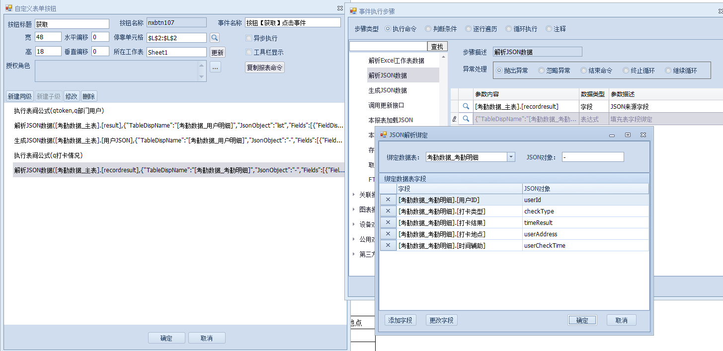 按钮绑定公式,注意由于打卡详情用户信息传入的格式是有要求的,所以需要在传入之前进行处理,这里用生成json将用户信息生成所需要的格式存到用户json字段