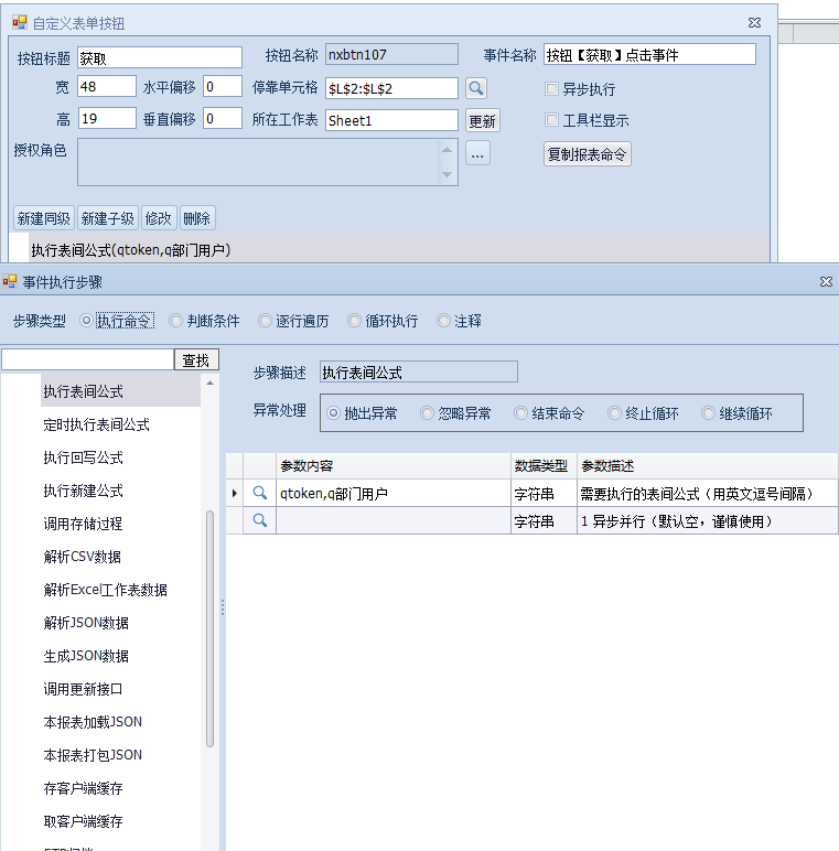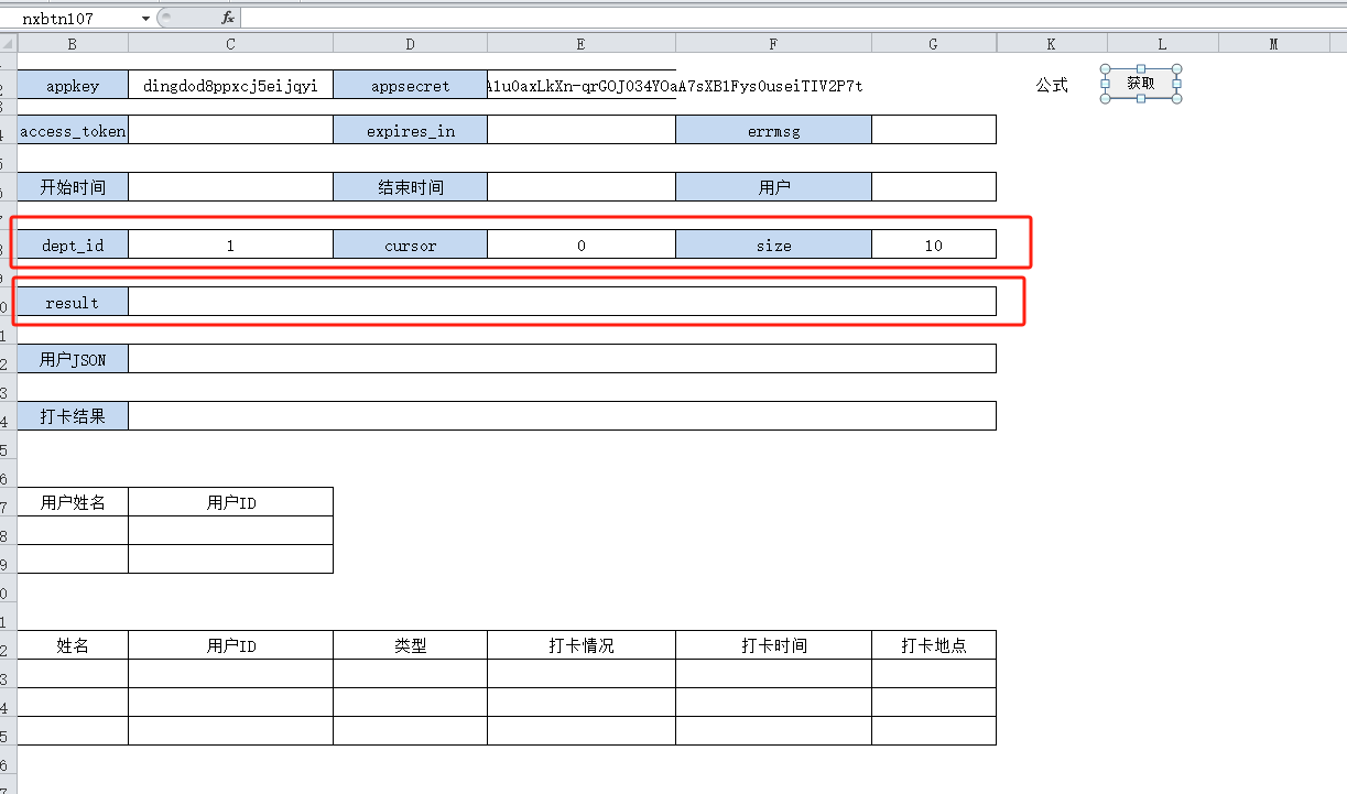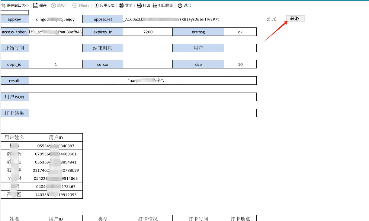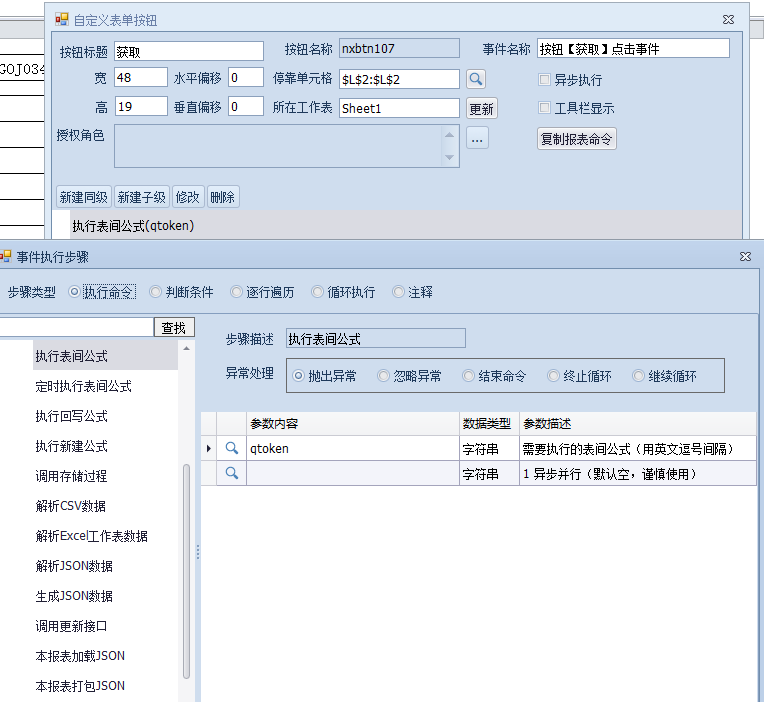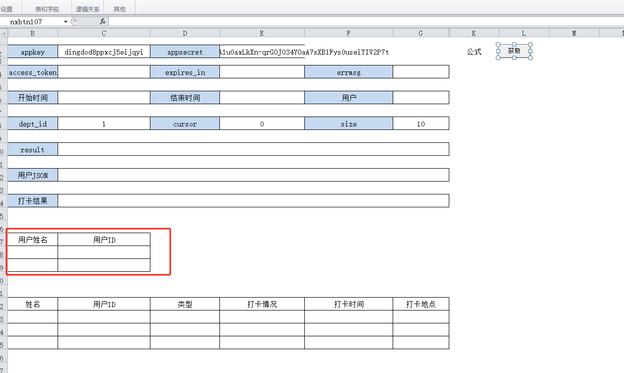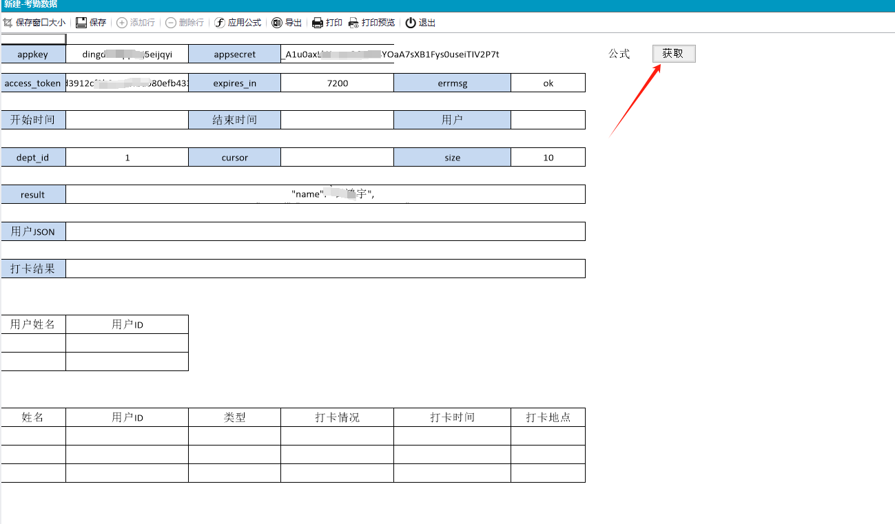 建立按钮【获取】先绑定该公式测试是否能获取access_token,右击选择【其他】-【插入报表按钮】
