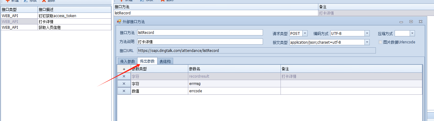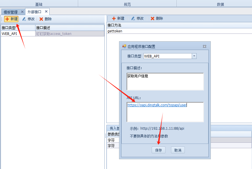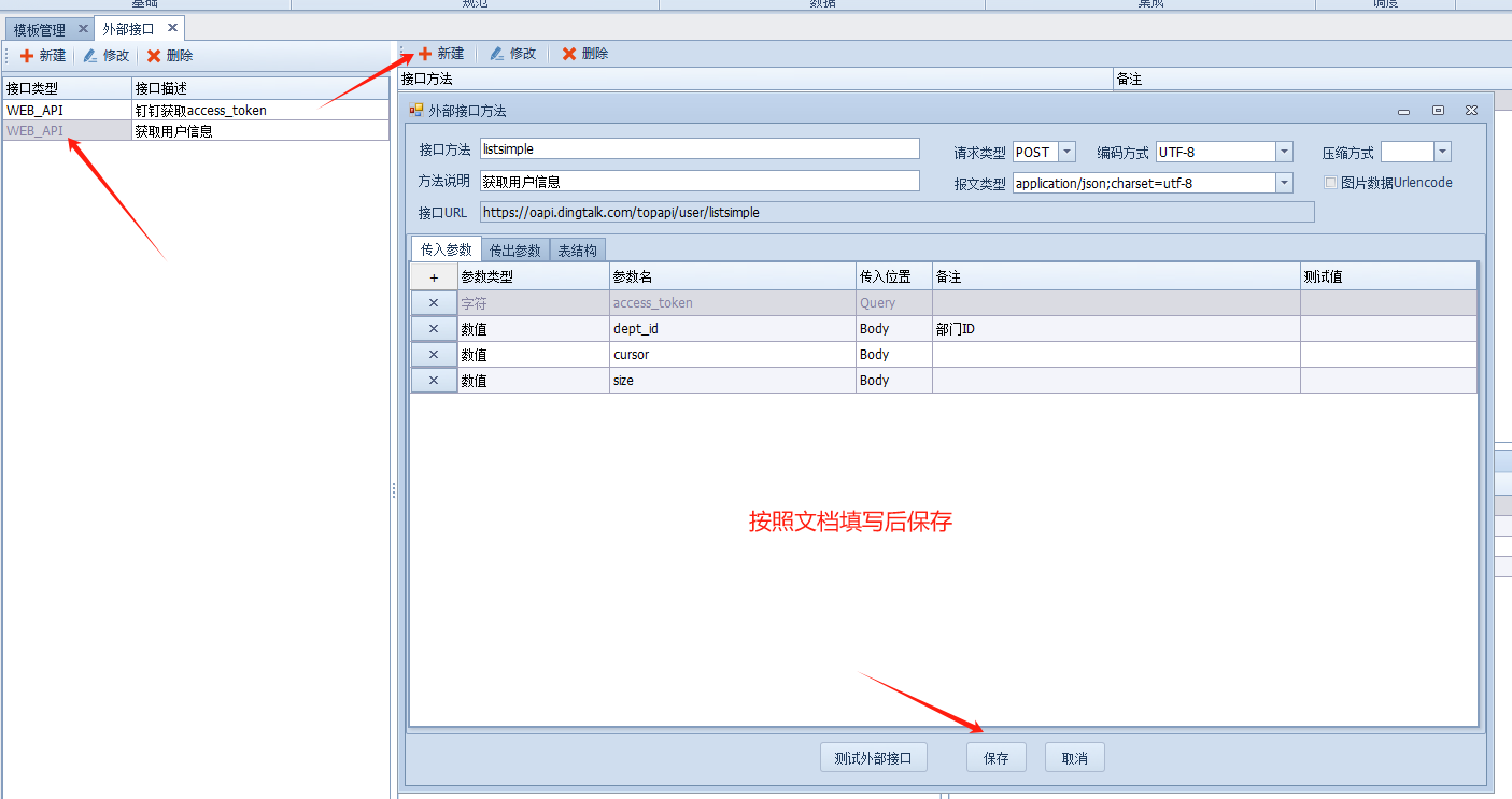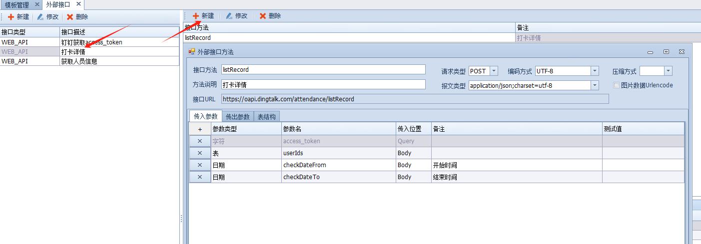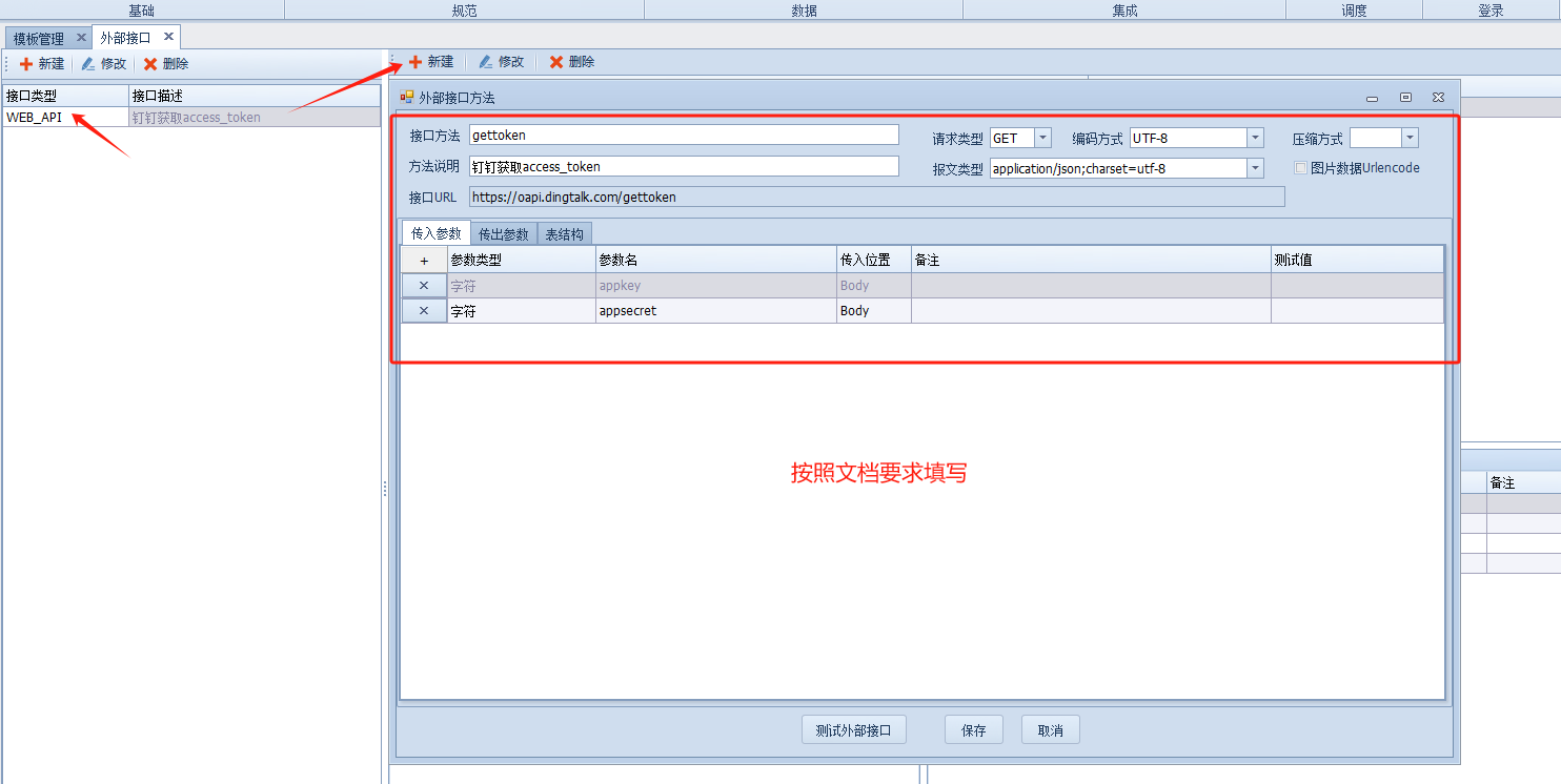 选中建立好的接口通讯,点击【新建】,接口方法、请求类型以及传入、传出参数、表结构在文档中都已明确给到。