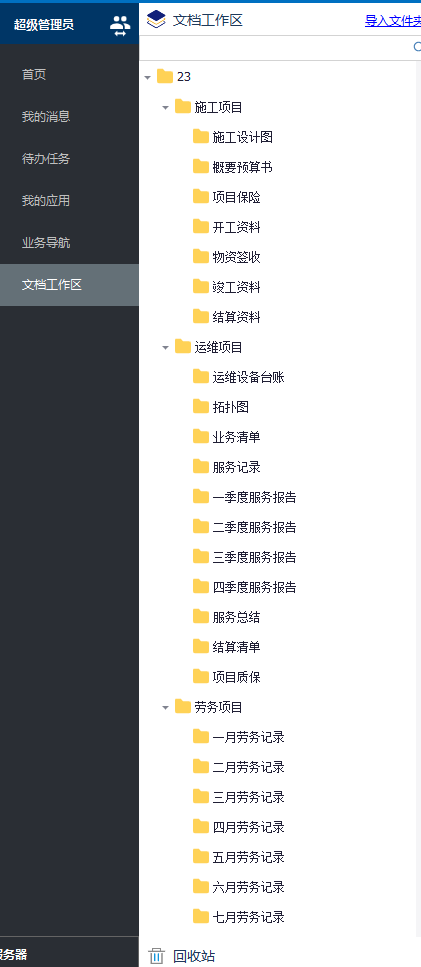 (1) 施工项目:施工设计图、概要预算书、项目保险、开工资料、物资签收、竣工资料、结算资料等