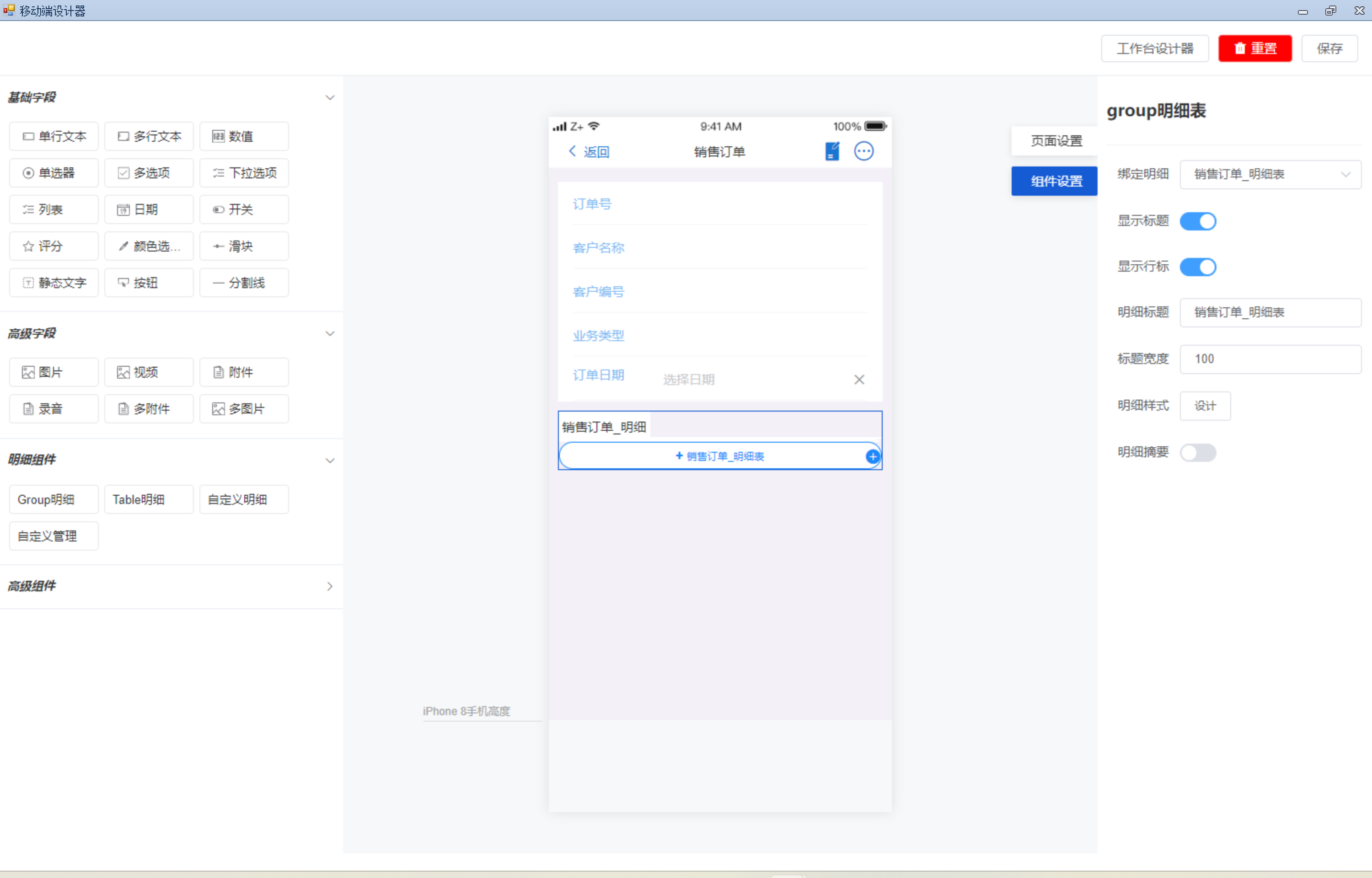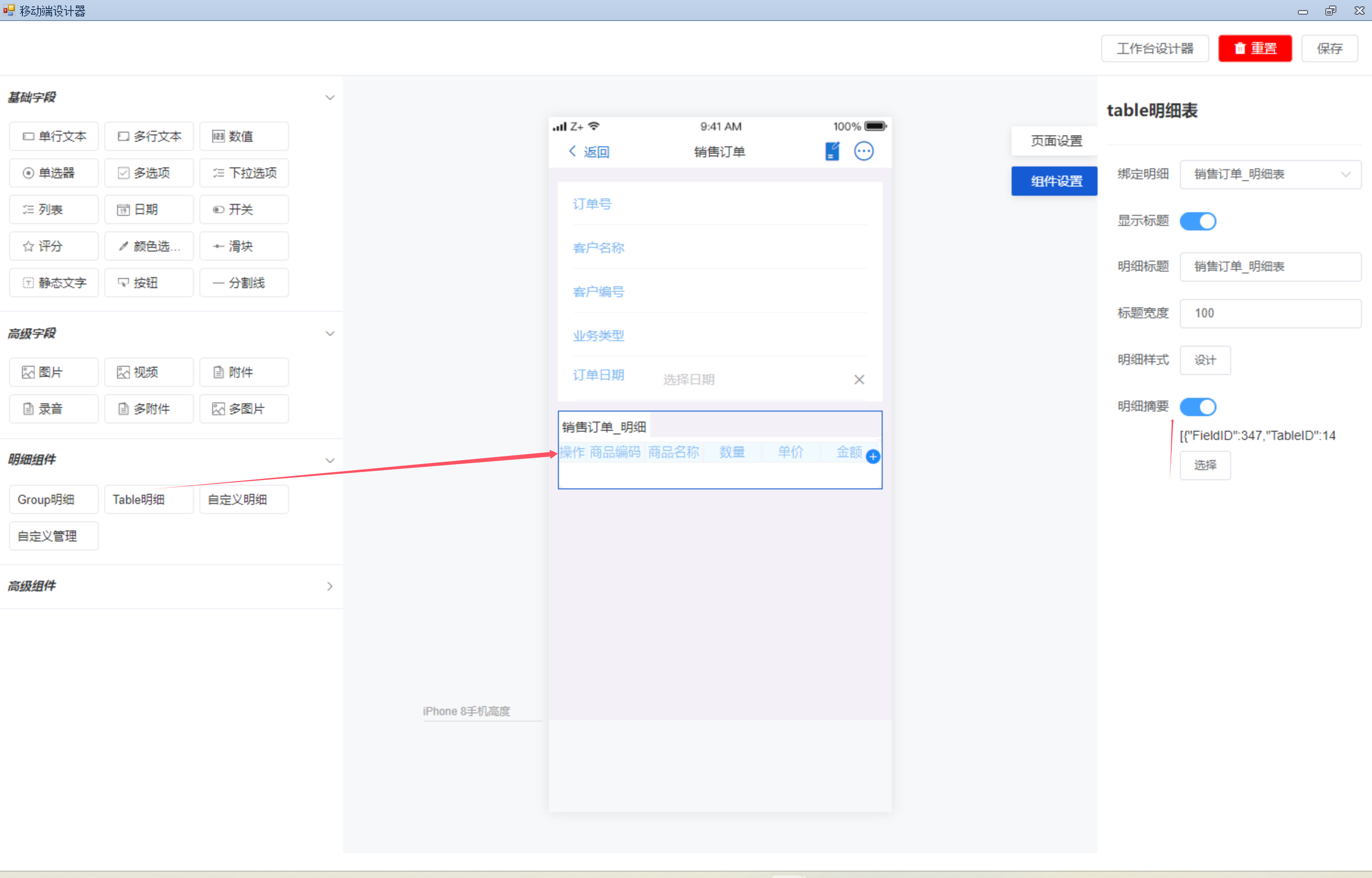 4.明细表点击明细摘要,勾选相应明细字段,并点击明细样式设计,设计明细表样式(字段需选择对应样式,如列表选择字段需选择列表)例: