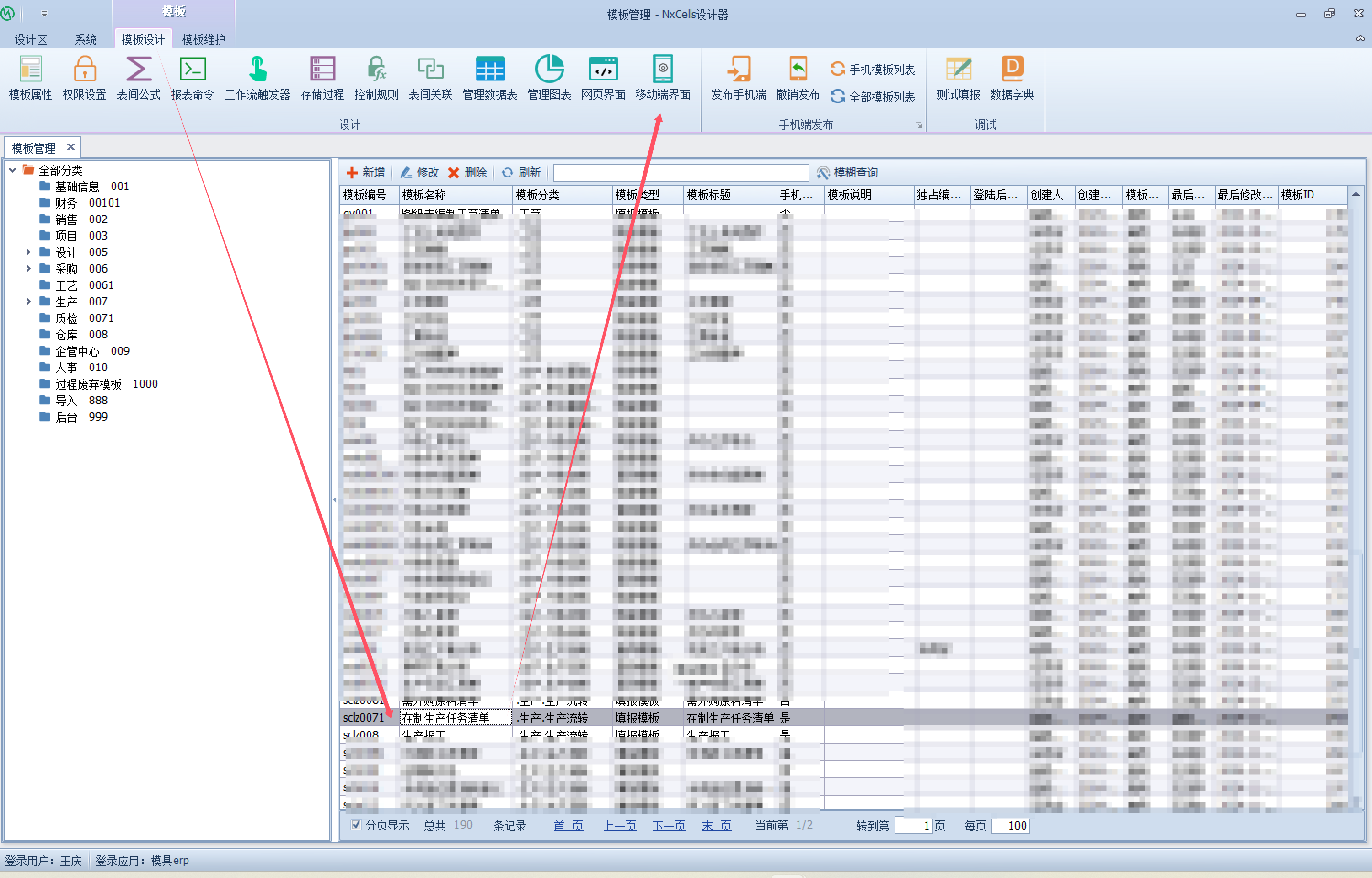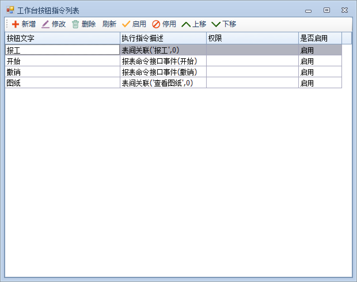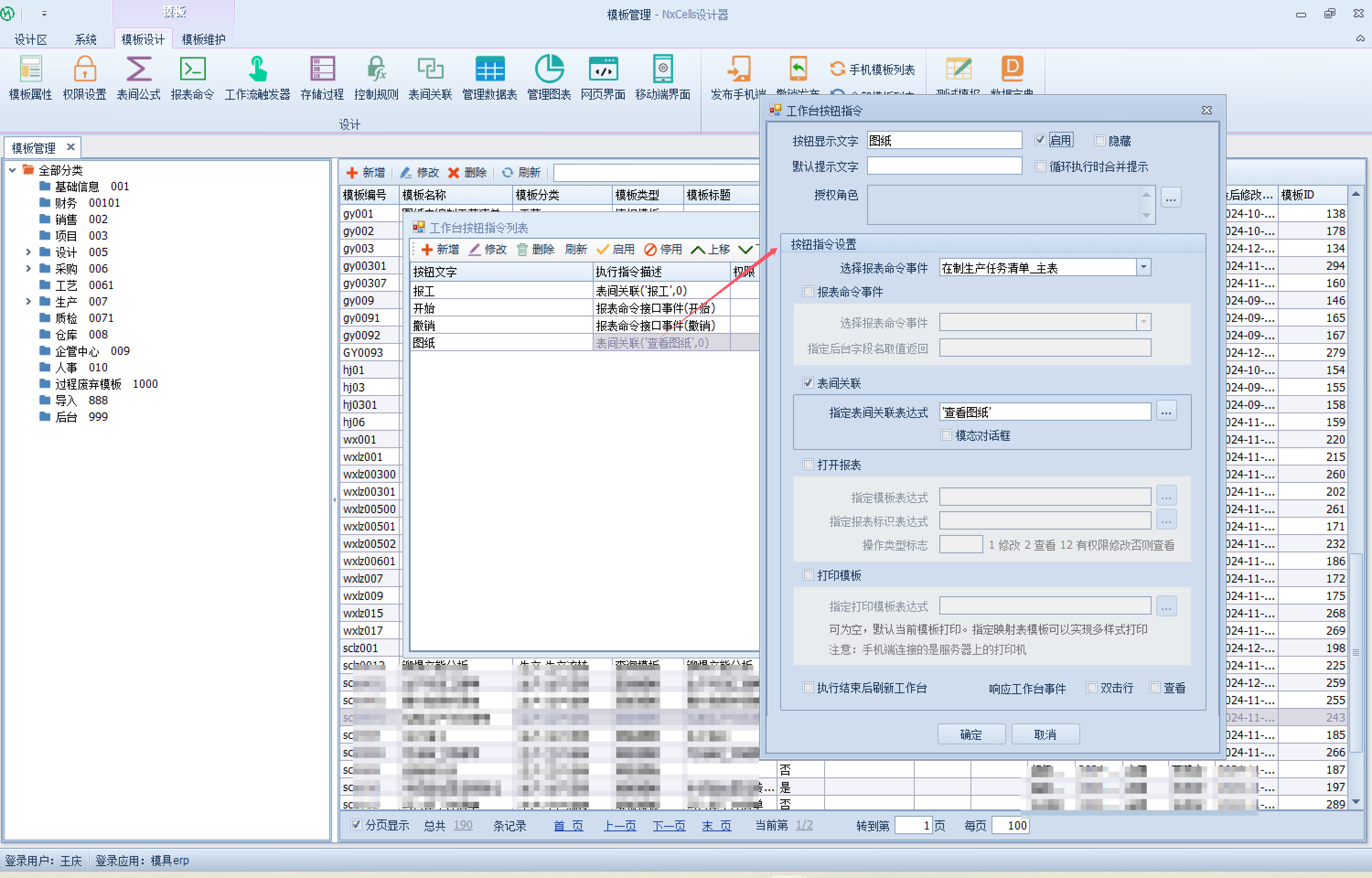 上一页 此处以在制生产任务为例,做移动端工作台按钮设计演示要实现工作台按钮效果,需要在设计端相关模板设计工作台按钮指令1.选择设计模板,点击移动端界面进入2.进入布局,点击工作台设计器进入3.设计工作台界面选择按钮字段并绑定相应工作台按钮指令,如下4.保存设计,进入移动端即可查看工作台设计效果 下一页作者:test 创建时间:2024-12-02 17:05最后编辑:wu 更新时间:2026-01-26 10:31