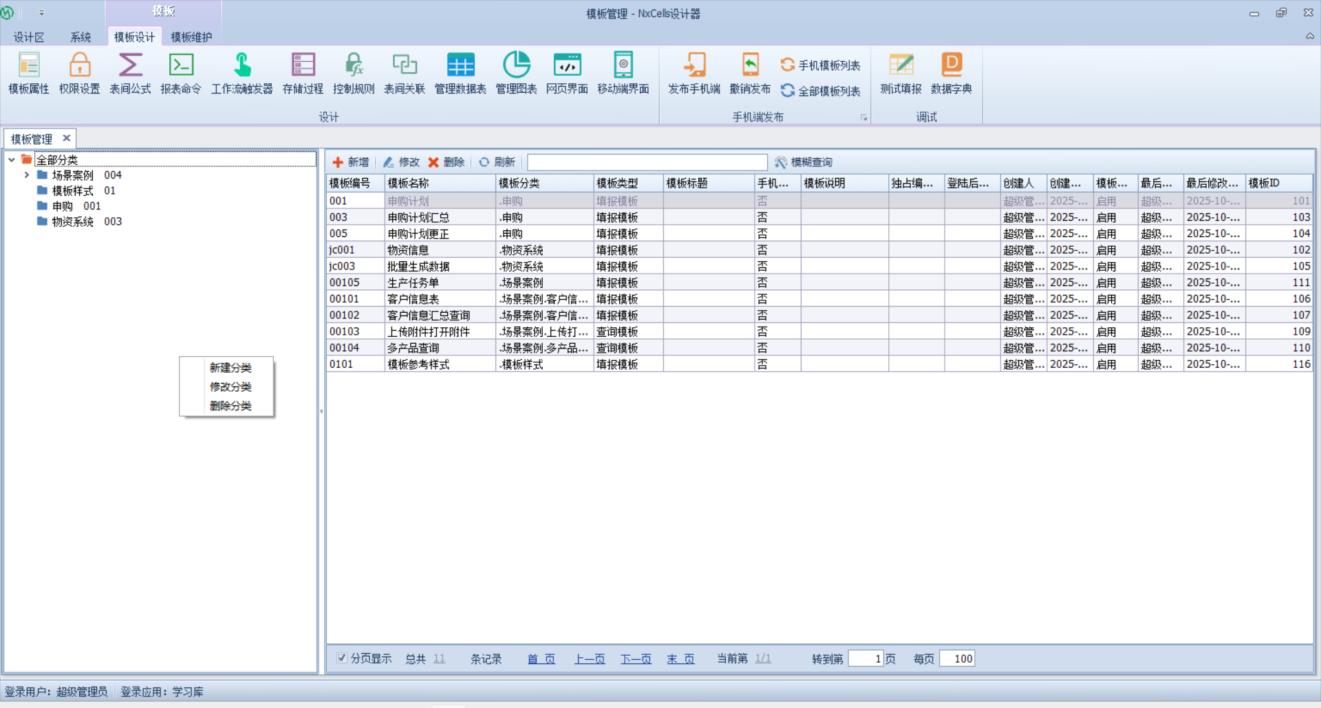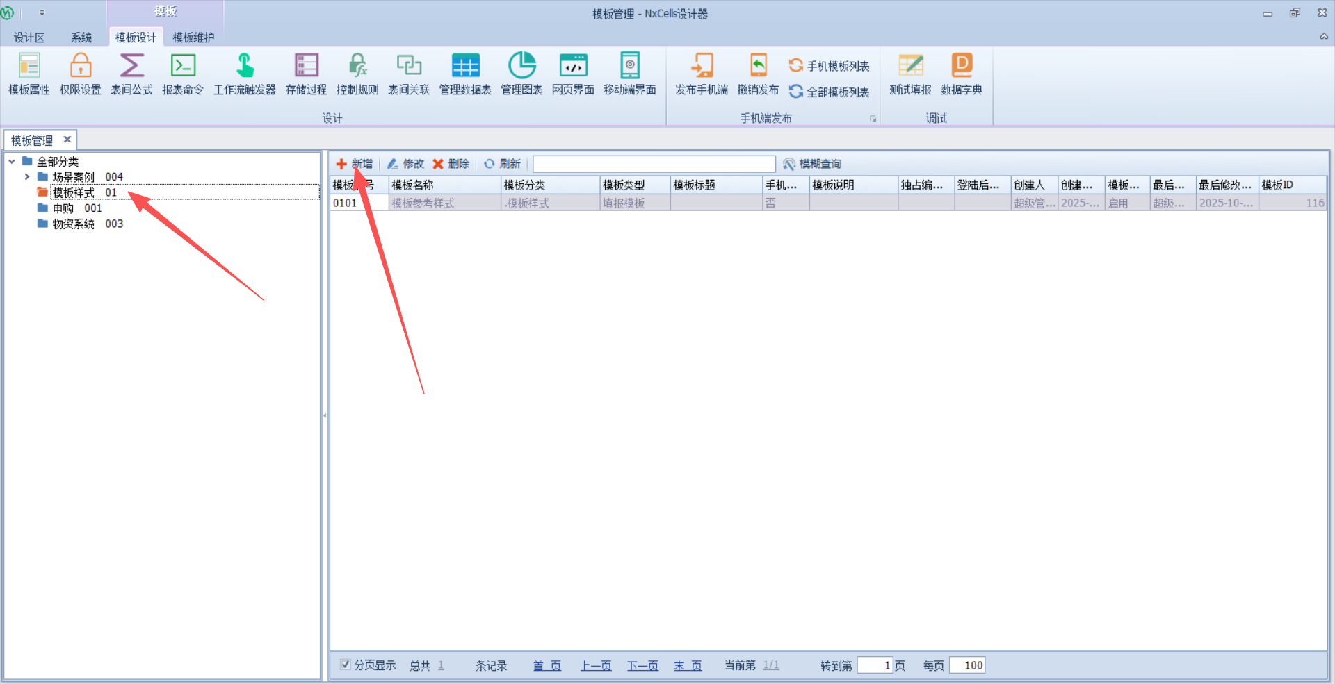 点击要创建模板的分类,点击新增按钮新增模板