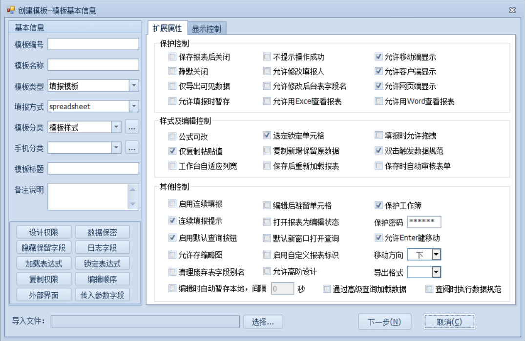填写模板编号(唯一),模板名称,选择模板类型:填报模板(存储数据),查询模板(临时查看),点击下一步