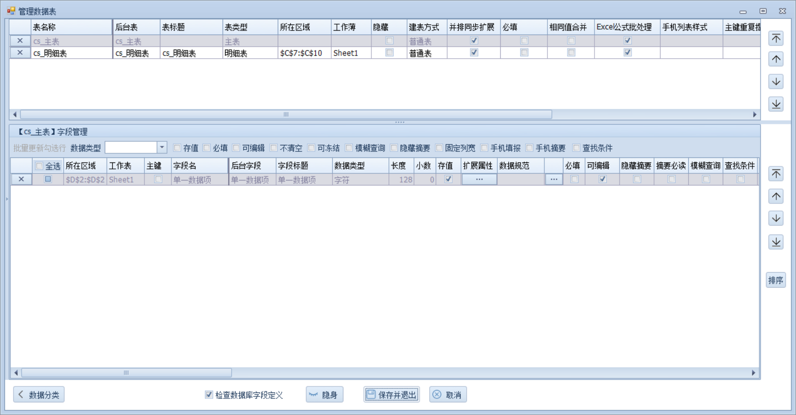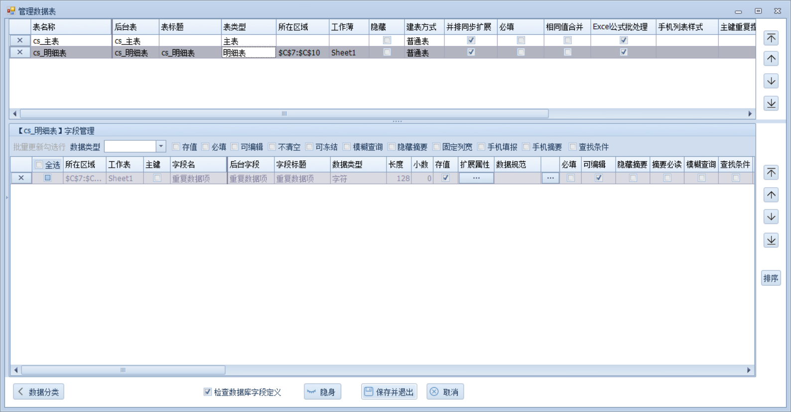 新建两个字段,单一数据项表单内唯一值,重复数据项表单内可出现多条数据的,单一数据项定义在主表中,重复数据项定义为明细表数据