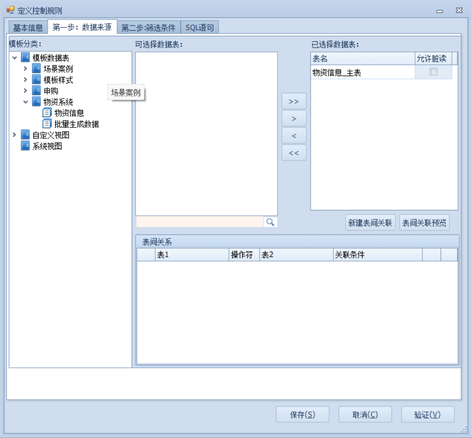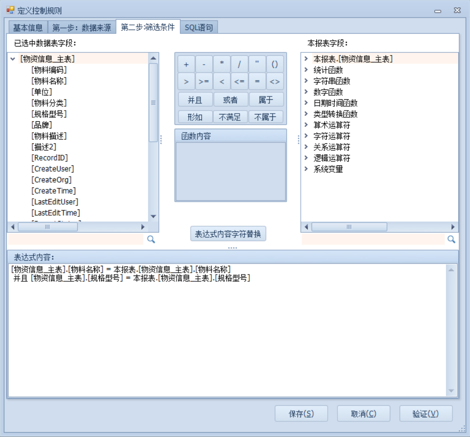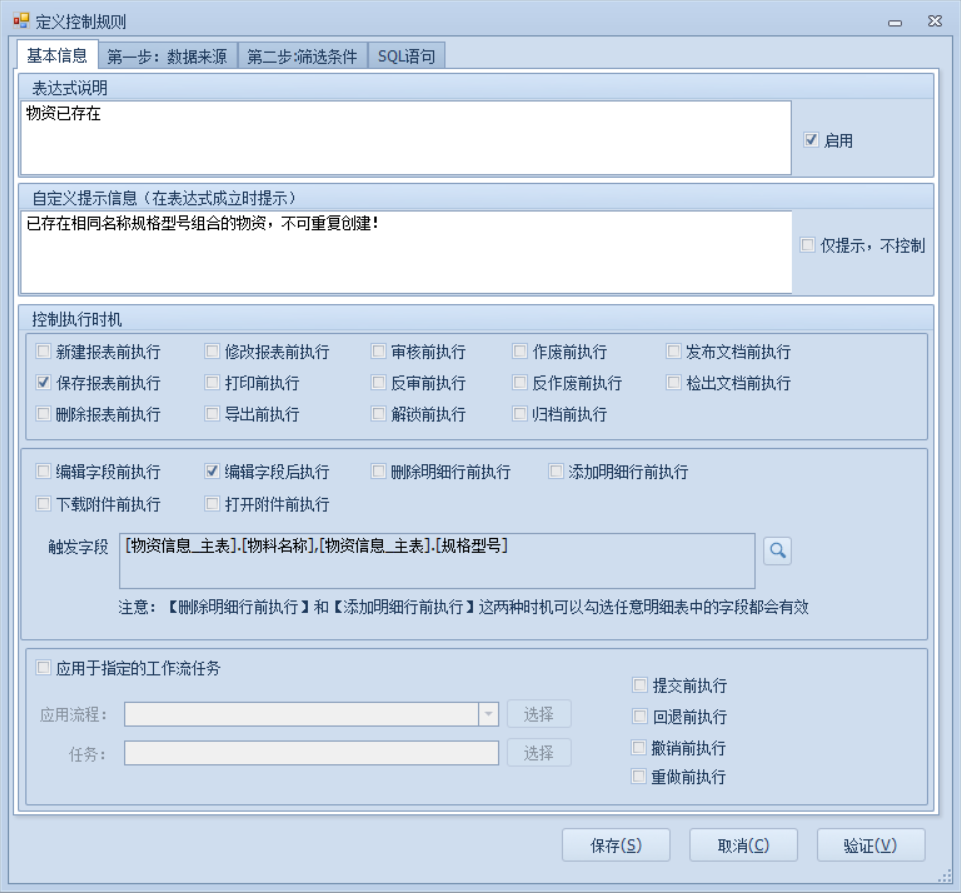 3.选择数据来源,设置筛选条件,确认后点击保存,到客户端查看效果,以已存在的物资为例,我们新建一个同物料名称规格型号的物资,保存时就会弹出我们设置的提示信息,不允许保存,以此来限制