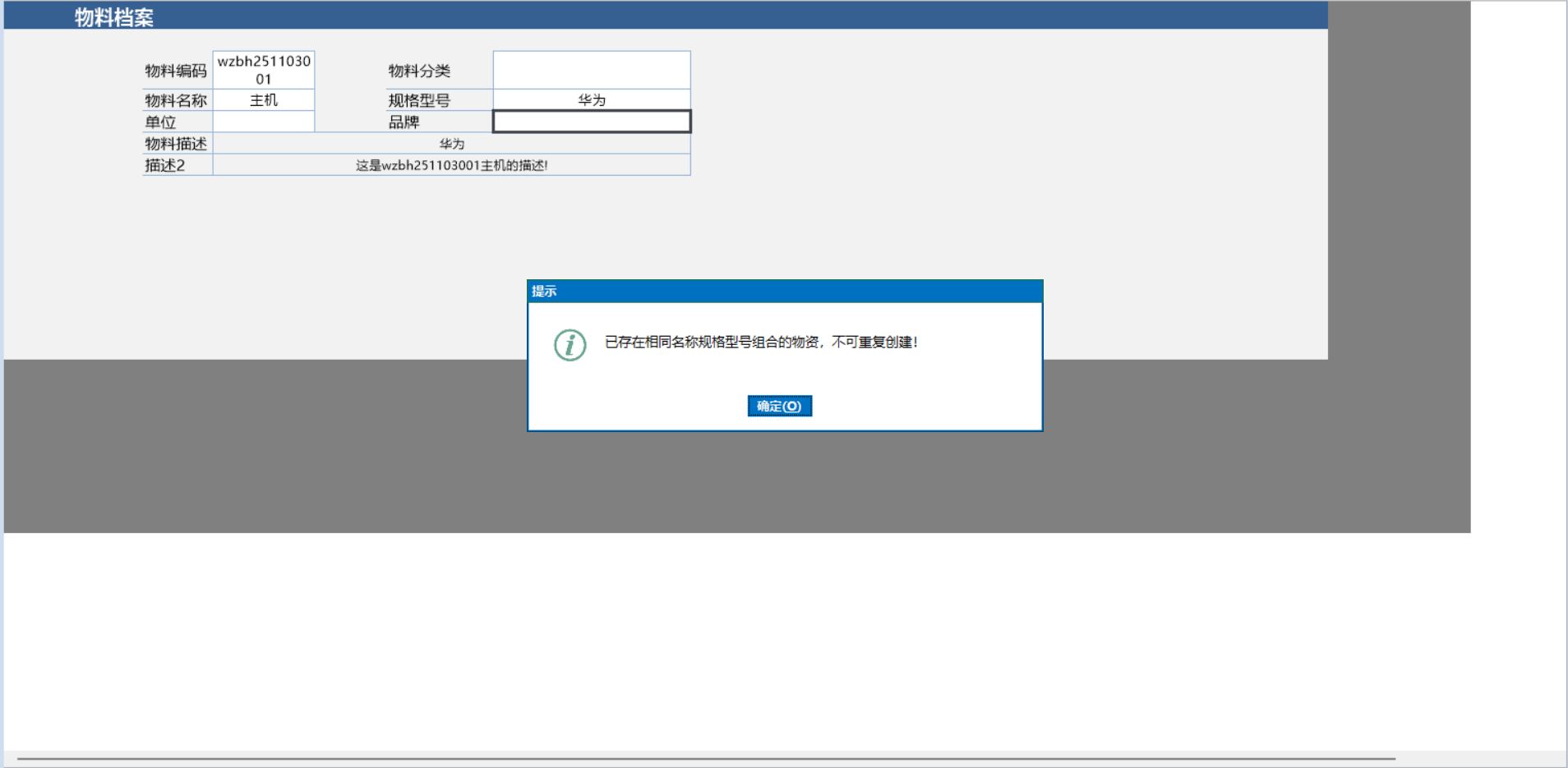 以物资信息表单为例,我们要控制同名称规格型号物资只出现一次,如果新建的一个物资在物资信息中,已经存在了相同的名称以及规格型号,我们现在不允许保存单据