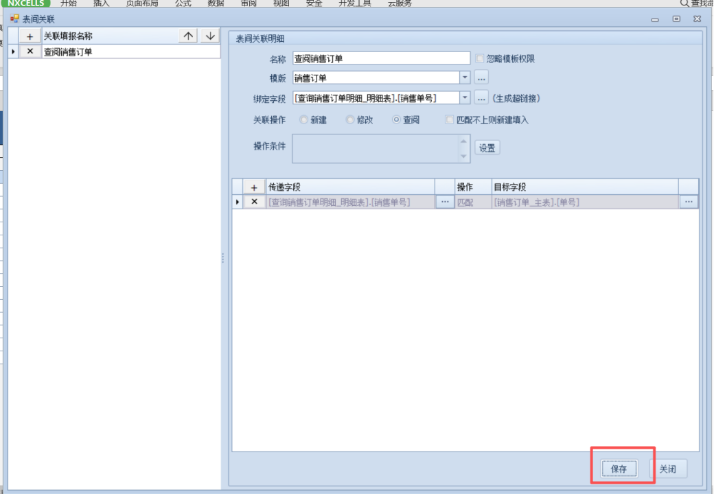 2.我们点击表间关联,点击加号按钮新增关联,填写表间关联名称,选择要关联的表单,选则绑定字段(会生成一个超链接),关联操作选择查阅,传递字段,我们使用明细表新增的销售单号字段去匹配销售订单的销售单号