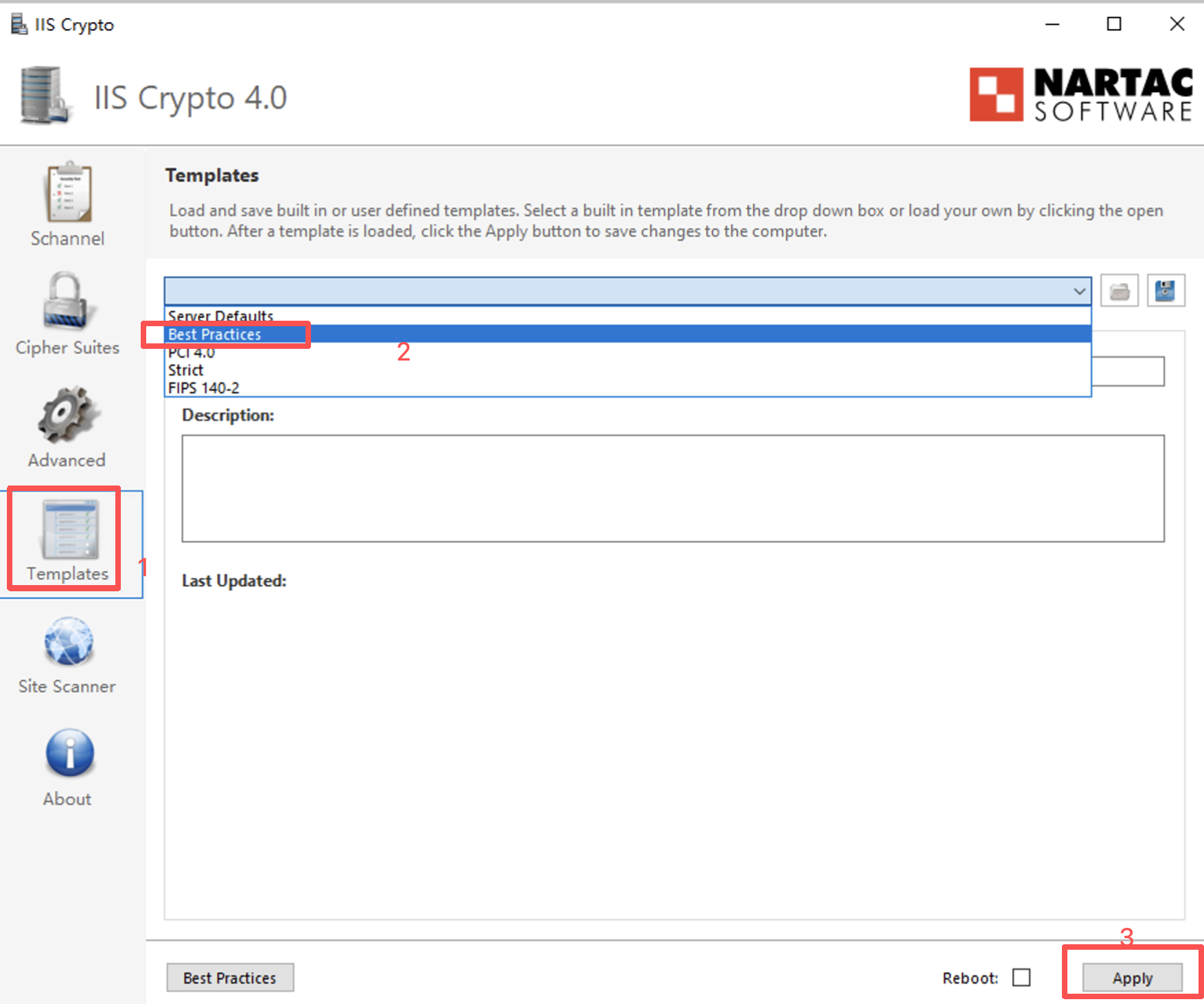 打开IISCrypto后,在“Template”(模板)下拉菜单中,推荐选择“PCI 4.0”或“Best Practices”模板(这些模板已预设启用TLS 1.2/1.3,禁用TLS 1.0/1.1及弱密码套件)
