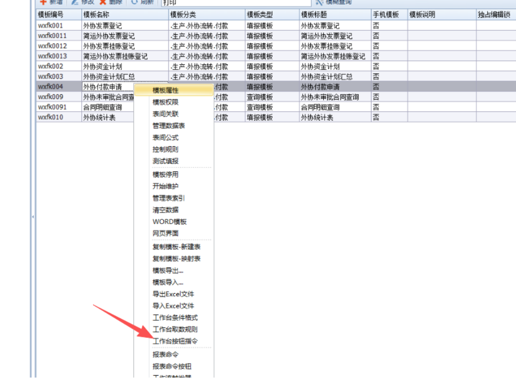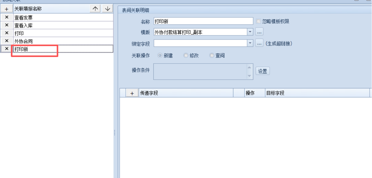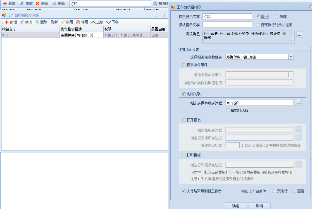 2.需要打印的单据模板设置表间关联,并设置工作台按钮绑定关联:
