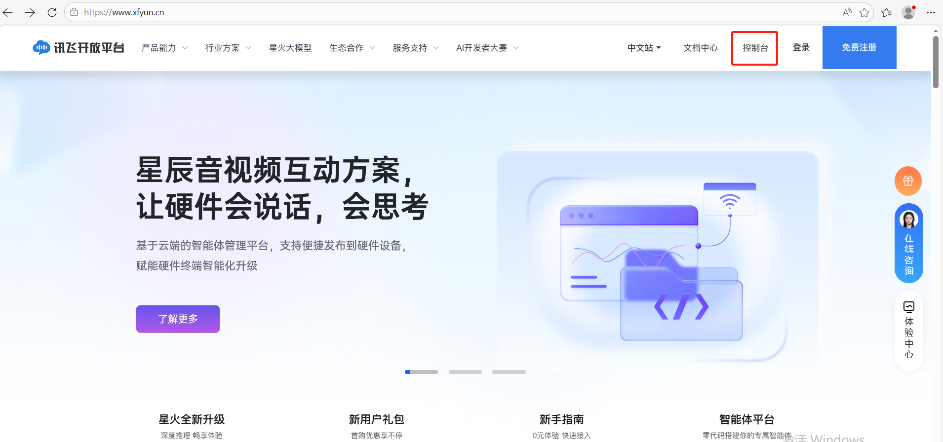 https://www.xfyun.cn/ 进入讯飞开放平台官网,注册登录,进入控制台